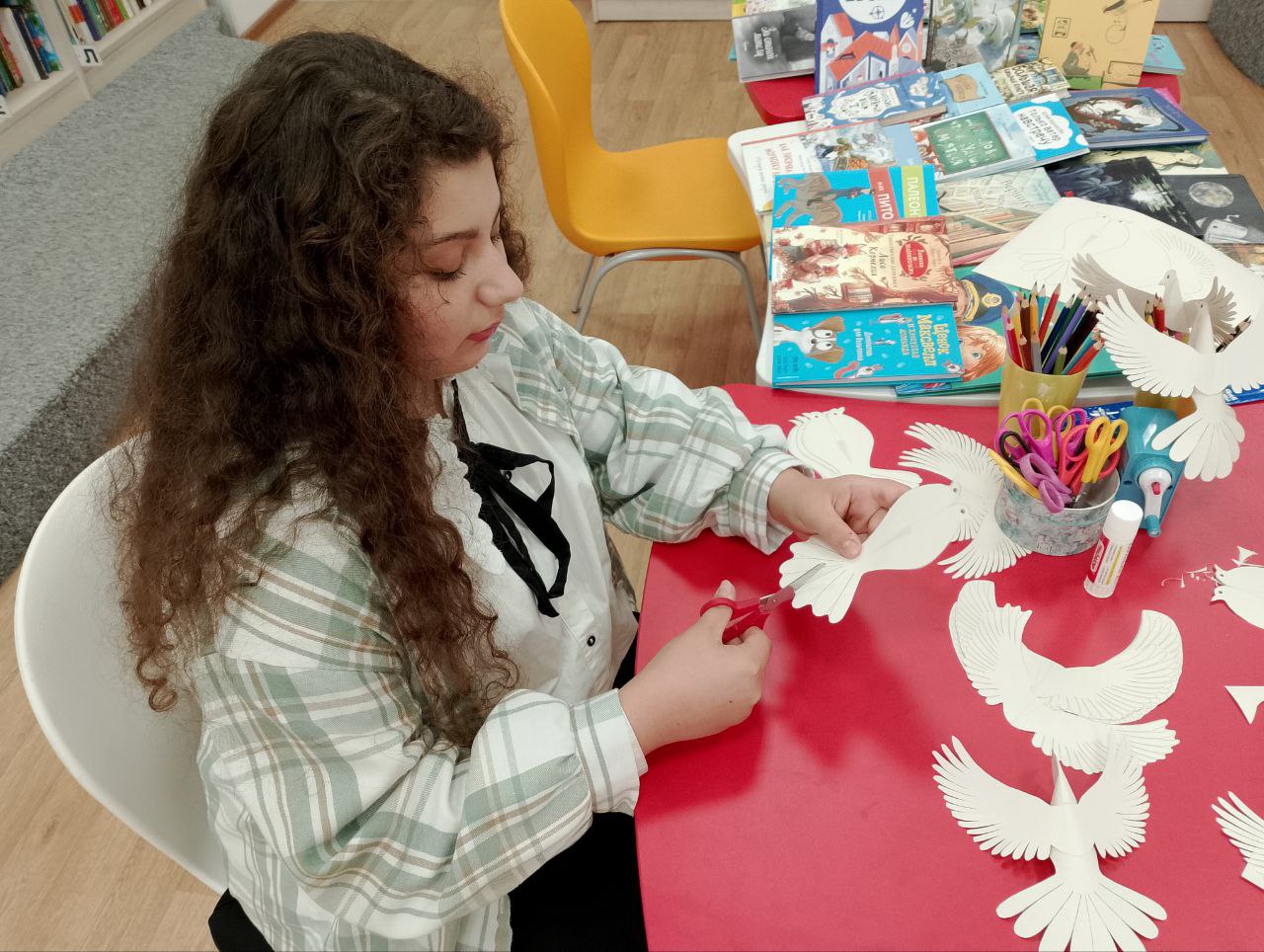 В программе акции был показан тематический информационный видеоряд, а после желающие приняли участие в мастер-классе по бумагопластике, на котором сделали своими руками белого голубя – символ борьбы за мир и против насилия.