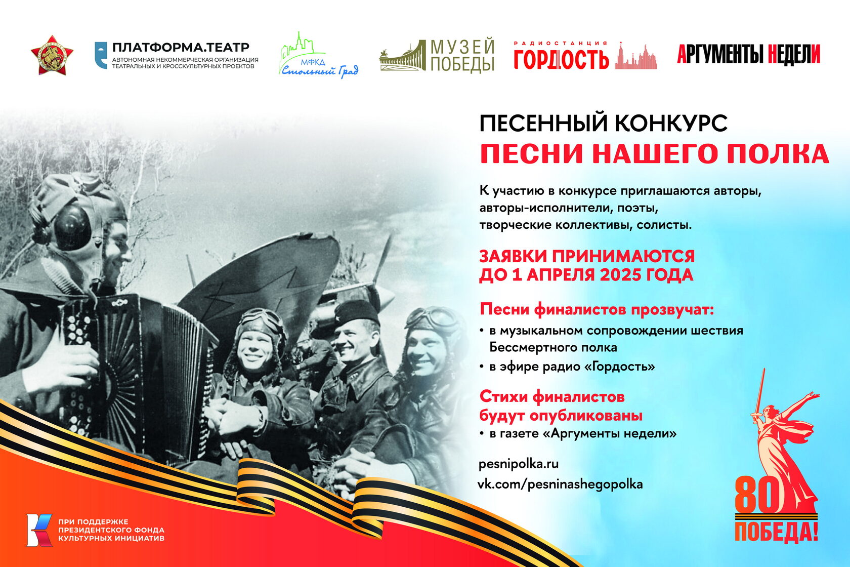 С января по май 2025 года при поддержке Президентского фонда культурных инициатив проходит IV Всероссийская патриотическая акция "Песни нашего полка", посвященная 80-летию Победы в Великой Отечественной войне.